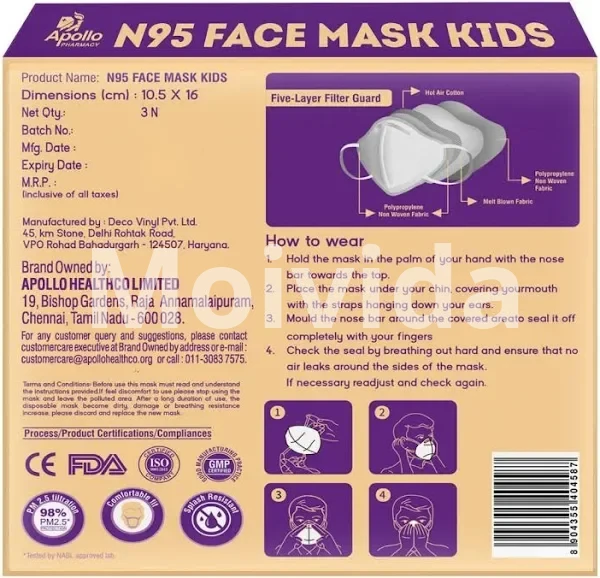 The Apollo Pharmacy N95 5 Layers Face Mask for Kids delivers advanced respiratory protection with an ergonomic, child-friendly design. Created for the daily safety needs of children, it effectively filters out pollutants, dust, and bacteria with its 5-layer filtration system. The lightweight, breathable build ensures comfort during prolonged use at school, playgrounds, and public areas.