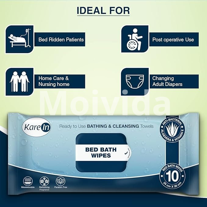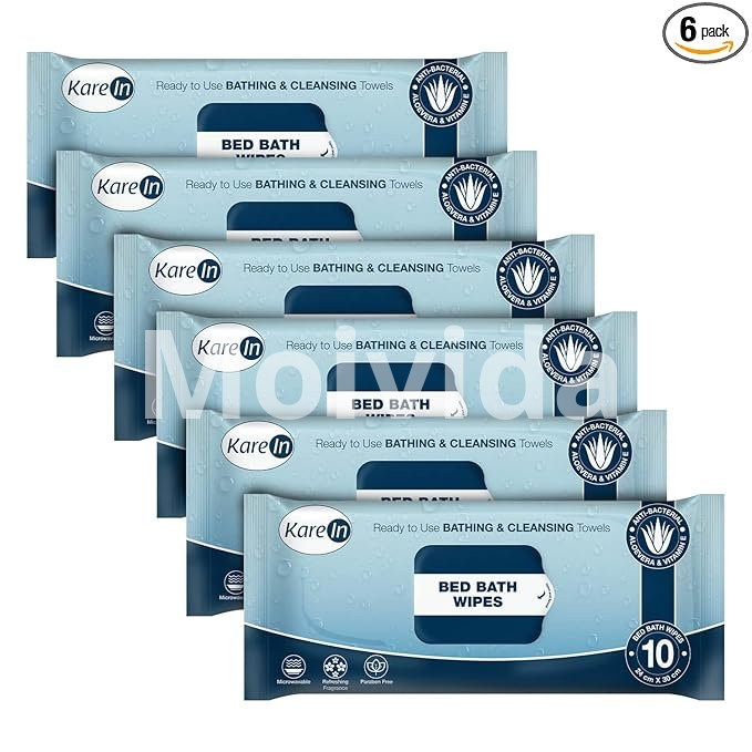 The KareIn Bed Bath Wipes (60 wipes) are a professional-grade hygiene solution created to make bathing easier, safer, and more comfortable for individuals unable to take a traditional bath. These wipes are pre-moistened, alcohol-free, and enriched with skin-friendly ingredients, providing effective cleaning while maintaining skin hydration and softness.
