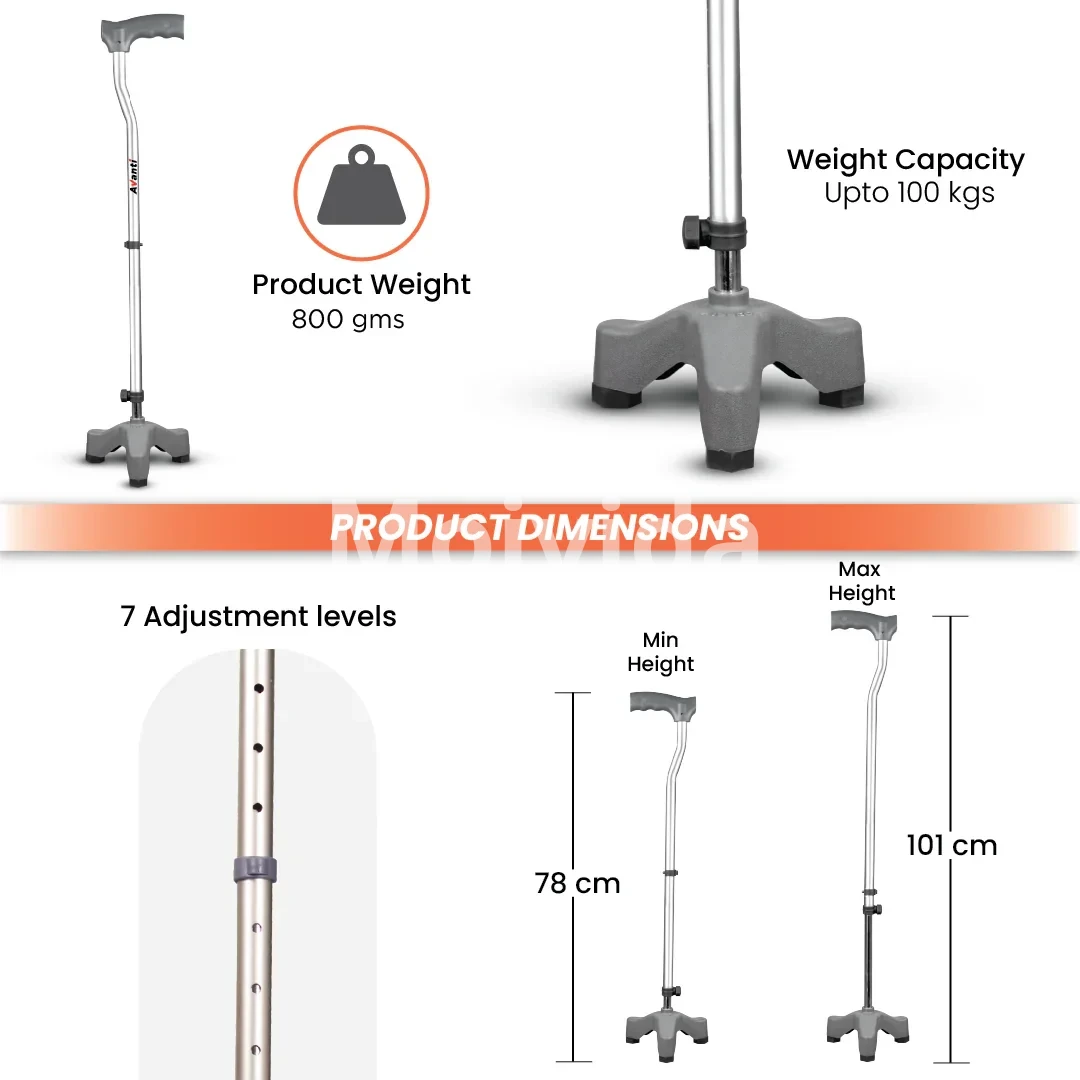 Walk confidently and safely with the Vissco Avanti L-Shape Tripod Walking Stick. Its ergonomic design, height adjustability, and sturdy tripod base provide the perfect balance of comfort and support. Regain your independence — buy now and experience stability with every step.